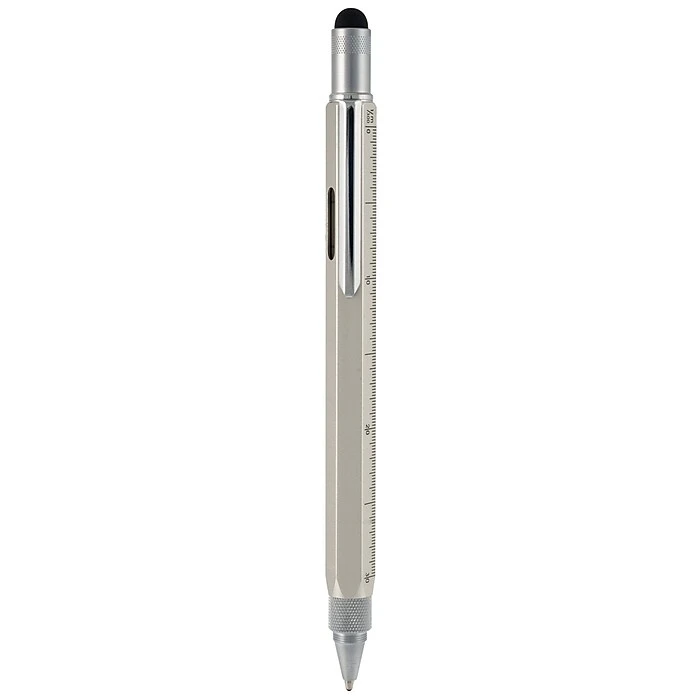Monteverde® Touch screen stylus tool pen in silver color has chiseled spring clip which will hold the one touch pen securely in pocket. Pen features a stylus on top and a built in level ruler.