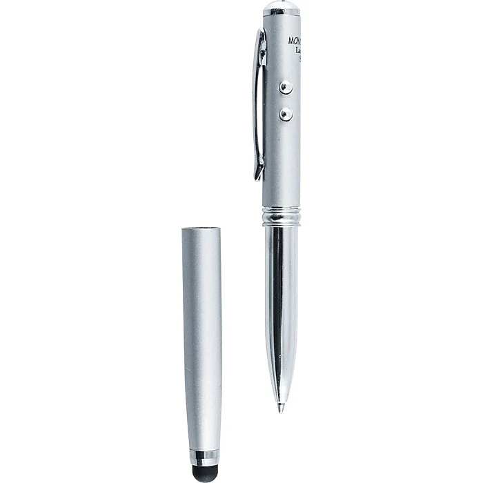 Monteverde® 4-in-1 Multifunction laser/stylus/flashlight/ballpoint pen with silver barrel features removable cap. Ballpoint pen requires 3 LR41 watch batteries.