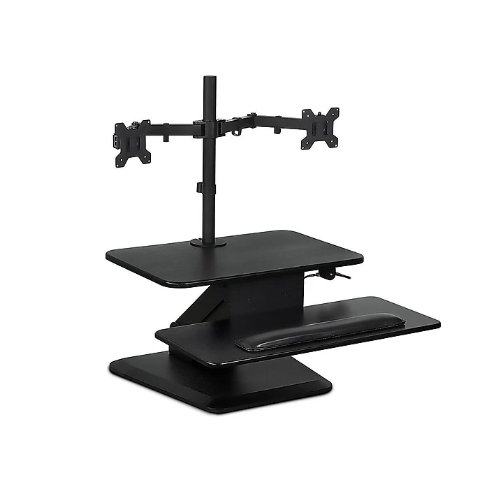 MI-7914 provides an easy and affordable way to stand while you work. This sit-stand desk converter sits on top of your existing desk and lets you work comfortably from either a sitting or ergonomic standing position. The spring-assisted lift mechanism allows you to raise and lower it in just seconds. The desktop platform and keyboard tray are sized adequately to support laptops, keyboard and mouse side by side. The included dual monitor mount increases productivity and frees up desk space. The full motion dual monitor mount can fit screens up to 27″, and the adjustable design lets you raise your monitors to a comfortable level. VESA head height can be adjusted up to 1” to perfectly align the height of your monitors.