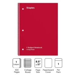 Staples 1-Subject Notebooks, 8″ X 10.5″, College Ruled, 70 Sheets, Assorted Colors, 6/Pack (TR58376)
