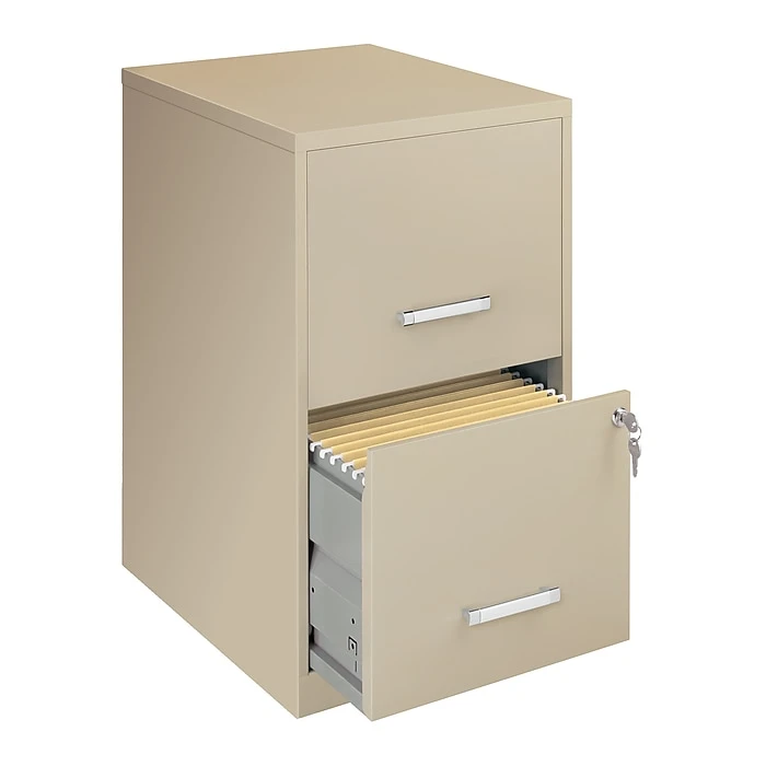 The Office Designs 2-Drawer Vertical File Cabinet in Putty lets you easily store gadgets and organize records. This vertical file cabinet features two deep drawers for letter-size hanging files and designer handles and glide suspension for smooth drawer movement. The Office Designs 2-Drawer Vertical File Cabinet comes in a stylish putty baked-enamel finish that fits in any room. The cabinet also comes with a built-in lock to secure your important files. Made from 30 percent post-consumer materials, this responsible 2-drawer file cabinet is backed by a one-year warranty.