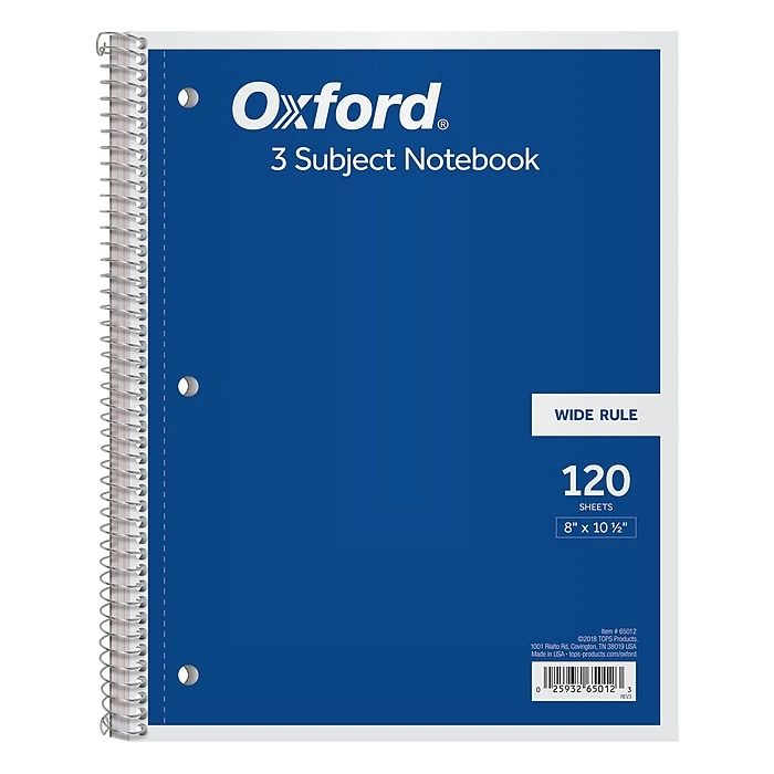 Oxford® 3-Subject Notebooks come in fun, bright colors. Each book includes 2 subject dividers and is 3-hole punched to fit a standard binder. Perforated sheets detach easily to keep your book neat and tidy. No-snag coil. Proudly made in the USA. 8″ x 10-1/2″. Wide ruled, 120 sheets. Receive a blue, green, violet, red or black cover. Colors randomly assigned for each order.