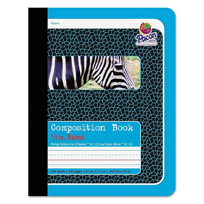 Pacon® 9 3/4″ x 7 1/2″ Composition book with 1/2″ ruling has a reference alphabet on the inside front cover. Book of 200 pages conforms to D’Nealian™/Zaner Bloser™ handwriting skills and features 1/4″ dotted midline.