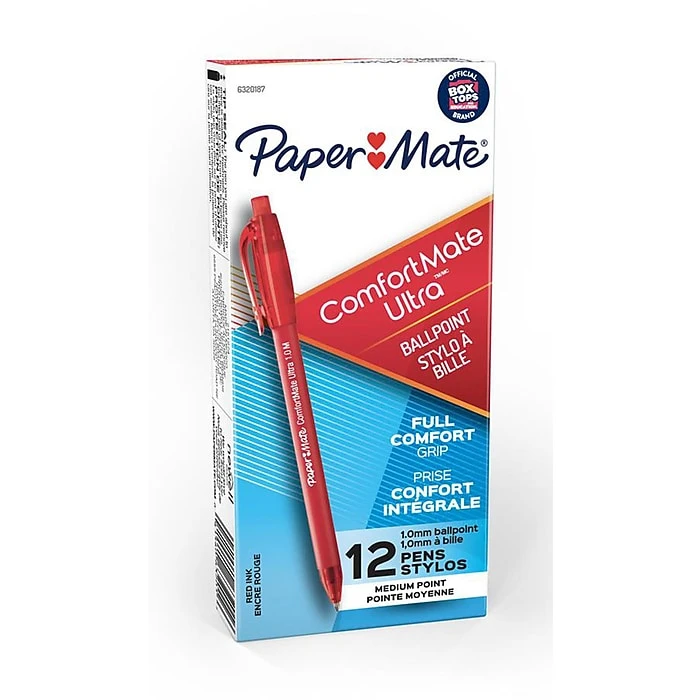 Write with precision using these Paper Mate ComfortMate Ultra retractable ballpoint pens. The slim designs have a reinforced metal point to prevent tip damage and a large ink supply to provide longer life. The medium point lets you make thicker lines without sacrificing accuracy. These Paper Mate ComfortMate Ultra retractable ballpoint pens have a triangular barrel grip for maximum control and comfort.