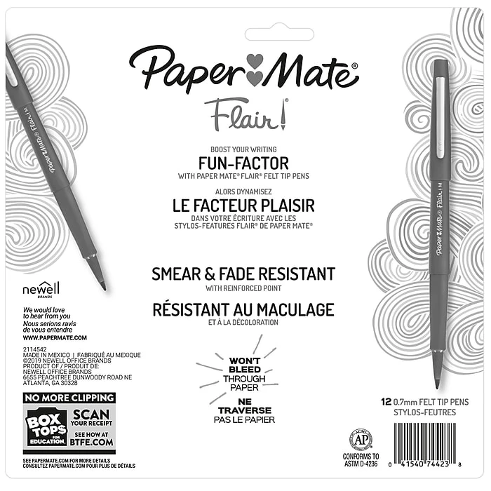 Add color to your calendar and all your general writing tasks with ease with these Paper Mate medium-point pens in assorted colors. The metal-reinforced felt tip delivers smooth, thick lines using long-lasting, water-based ink that dries quickly to resist smudges. These felt pens feature a plastic construction that matches the ink color and a secure cap with a pocket clip to prevent dry out.