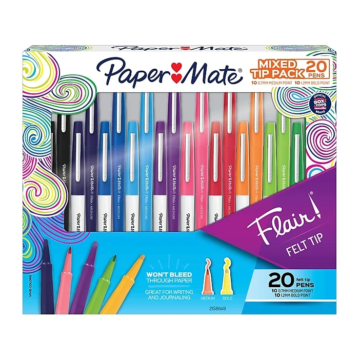 Paper Mate Flair felt tip pens will have you enjoying writing. Each of the pens features a Point Guard to prevent the tip from fraying, so you always produce neat lines even after repeated use. With quick-drying, water-based ink that resists smearing, these porous pens always leave a great impression. The ink is also specially designed so that it won’t bleed through paper. A range of vivid ink colors makes it easy to express yourself with flair. Every stroke produces bold, clean lines that are perfect for drawing, writing, editing, and checking papers.