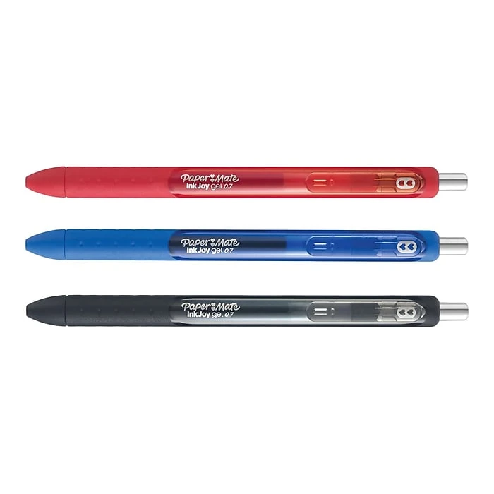 Keep anything you write from smearing or smudging by using these medium-point assorted gel pens. The ergonomic grip delivers enhanced control and makes long writing projects more comfortable, while the medium point delivers rich lines that don’t skip or bleed through paper. This pack of Paper Mate InkJoy gel pens comes with three assorted colors, providing versatility.