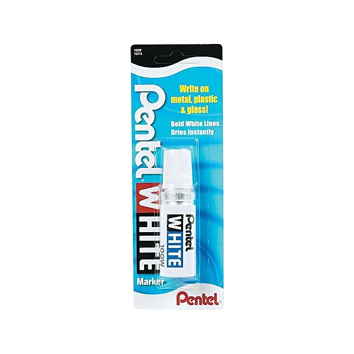 Produce bold lines with this permanent marker that is ideal for use on glass, plastic, wood or metal surfaces. The permanent and non-washable ink in this marker is made with a quick-dry formula that reduces smudges and smears. This white Pentel bullet-point marker has a valve control device that provides an even flow of ink for smooth writing.