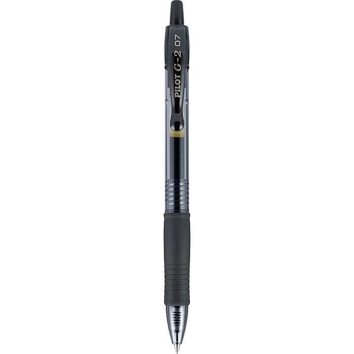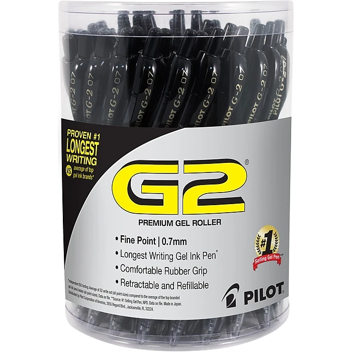 Create clearly defined lines with these black retractable gel-ink pens. The transparent barrel’s contoured rubber grip provides a comfortable hold for smooth, controlled writing and the retractable design offers instant use with a simple click. These Pilot G2 fine-point pens come in a 36-pack plastic container for quick access and convenient storage.