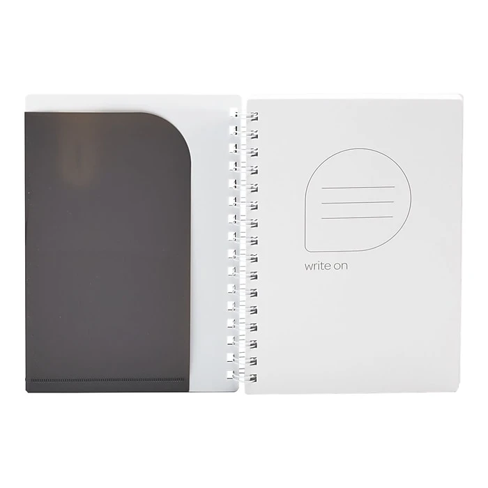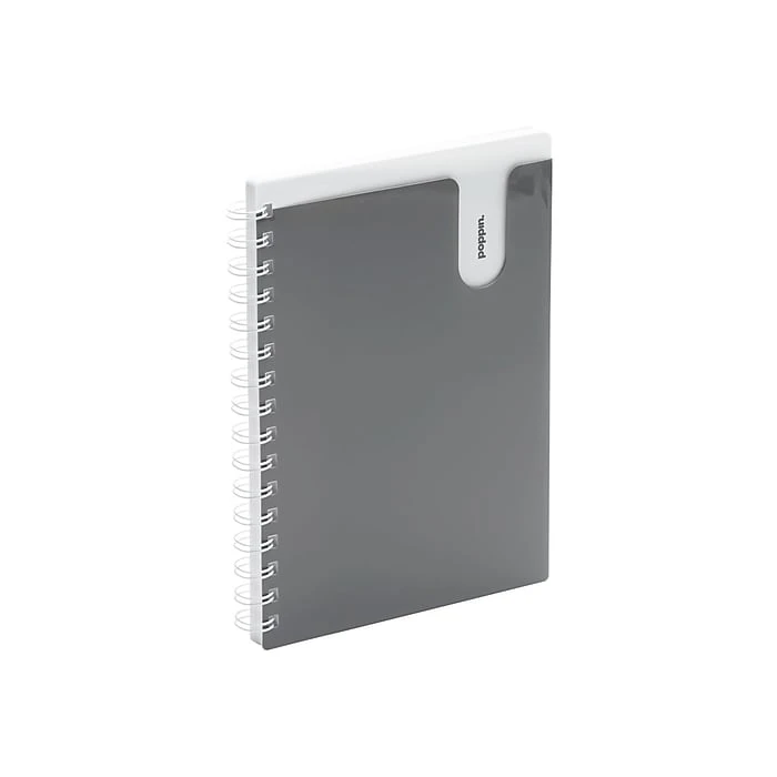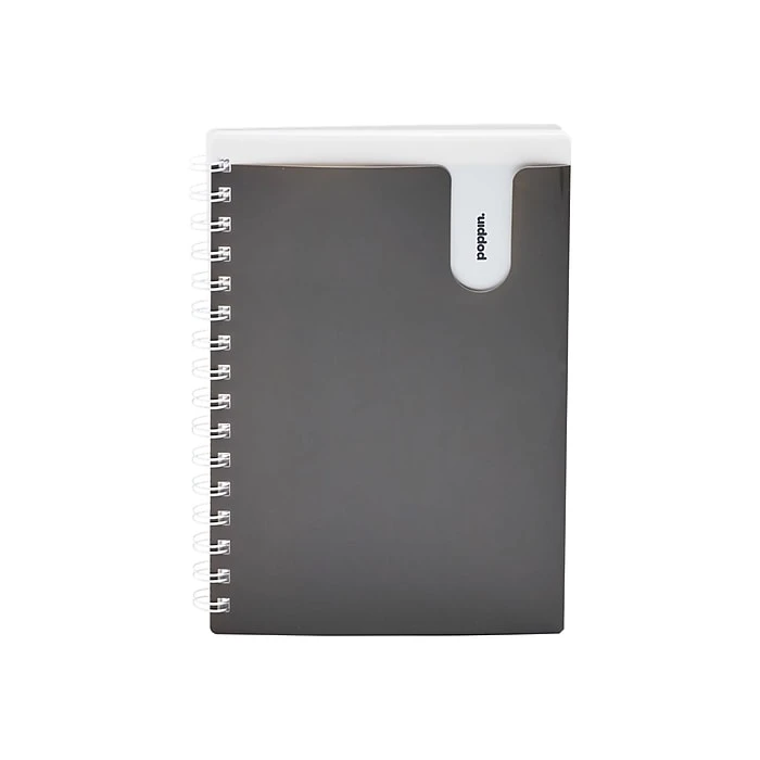 Refer back to past writing easily with this spiral notebook. The front cover pocket provides convenient storage space for loose papers, while the durable exterior protects contents from moisture, rips, and other damage. This Poppin medium pocket dark gray spiral notebook has a sturdy spiral binding, so you can flip through pages easily and write more comfortably.