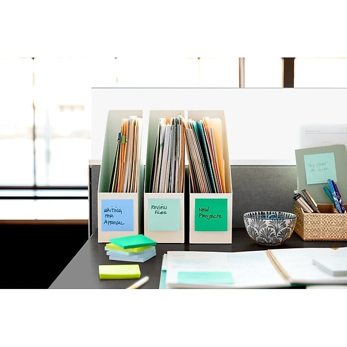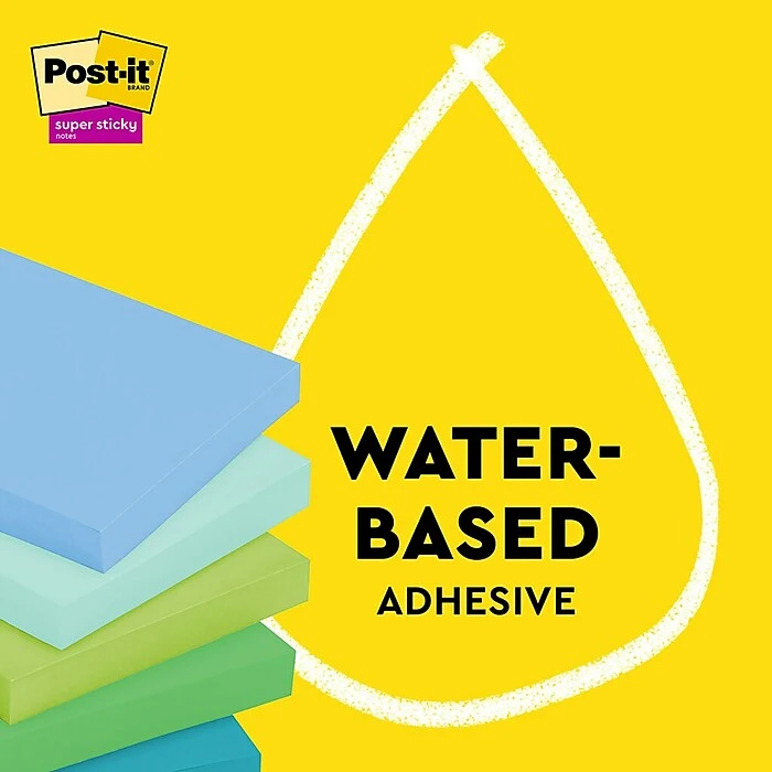 Post-it® 100% Recycled Paper Super Sticky Notes are made from 100% recycled paper and feature 2X the sticking power to make sure your message stays put. The water-based adhesive reliably sticks to doors, windows and walls, so you can take your notes anywhere. Post-it® 100% Recycled Paper Super Sticky Notes and packaging are curbside recyclable. Succeed in your everyday tasks and feel good knowing these notes are made in a zero-waste-to-landfill plant. Packaging is also made from 100% recycled paper. Keep calm and collected with the tranquil blues and greens of the Oasis Collection. 5 Pads/Pack, 70 Sheets/Pad.