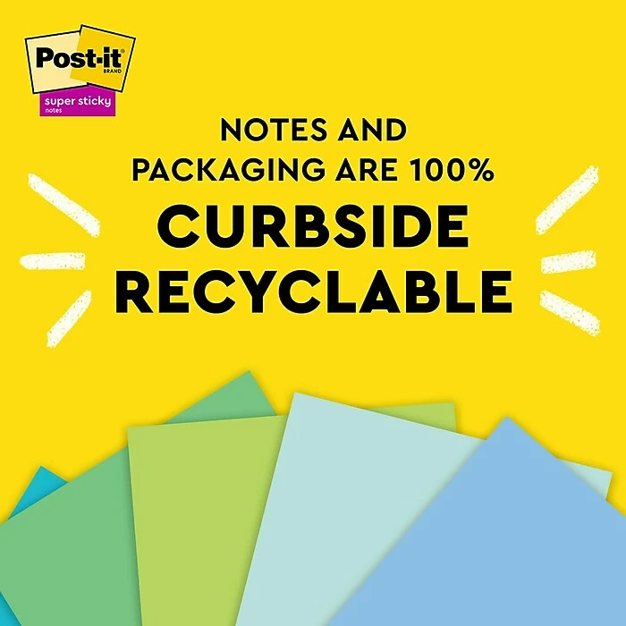 - Post-it® 100% Recycled Paper Super Sticky Notes and packaging are curbside recyclable.
