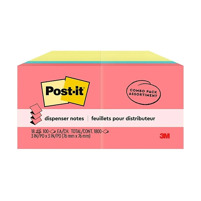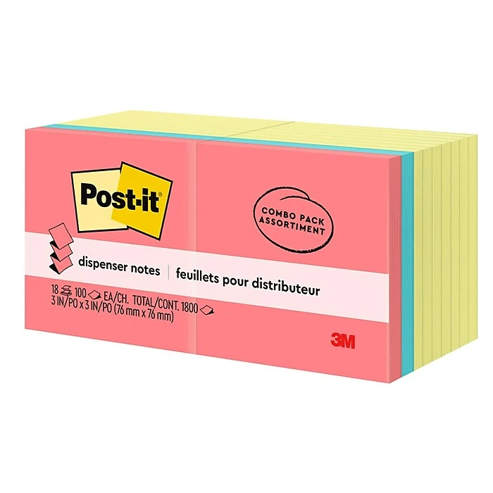 Post-it® Dispenser Notes in 3 in x 3 in are accordion-style notes are specially designed to work in Post-it® Note Dispensers, and allow you to always have a note nearby to capture great ideas. Unique adhesive designed for use with paper or in planners. Use for notes or reminders on doors, windows or walls. Classic Canary Yellow color helps your note break through. Free pads in bright colors allow you to keep your message front and center. Post-it® Dispenser Notes are recyclable and the paper is sourced from certified, renewable and responsibly managed forests. 18 Pads/Pack, 100 Sheets/Pad.