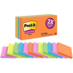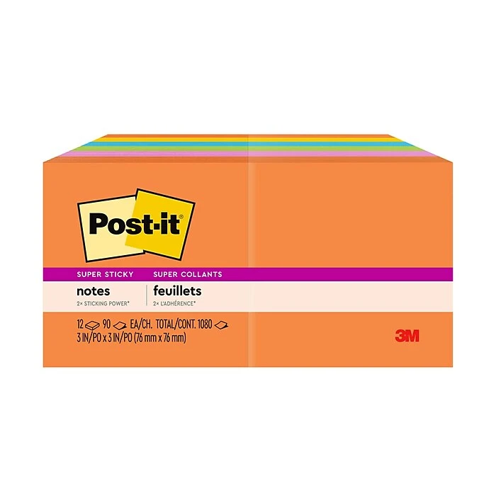 Post-it® Super Sticky Notes in 3 in x 3 in feature 2x the sticking power. Use for notes or reminders on doors, windows or walls. Unique adhesive reliably sticks and re-sticks so your message can stay front and center. Move your notes with you throughout the day. Uplift your spirits and messages via the vibrant, strong colors of the Energy Boost collection. 12 Pads/Pack, 90 Sheets/Pad. Post-it® Super Sticky Notes are recyclable and the paper in Post-it® Super Sticky Notes is sourced from certified, renewable and responsibly managed forests.