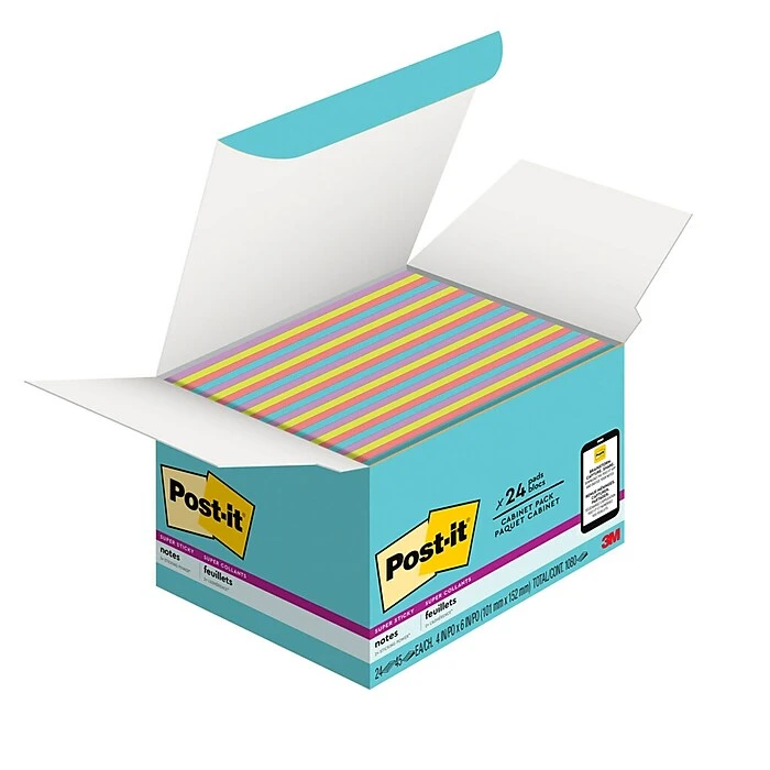 Post-it® Super Sticky Notes in 4 in x 6 in feature 2x the sticking power. Use for lists or longer notes on doors, windows or walls. Unique adhesive reliably sticks and re-sticks so your message can stay front and center. Move your notes with you throughout the day. Post-it® Super Sticky Notes are recyclable and the paper in Post-it® Super Sticky Notes is sourced from certified, renewable and responsibly managed forests. Take ideas out of this world with electric colors from the Supernova Neon collection. Cabinet packs can help you stock up your home, office or classroom. This pack comes with the colors Aqua Splash, Acid Lime, Guava and Iris Infusion. 24 Pads/Pack, 45 Sheets/Pad.