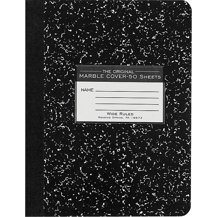 Smooth 15# wide ruled line paper with margin. Black marble pattern hard board covers. Inside has class schedule & other information. Made in USA