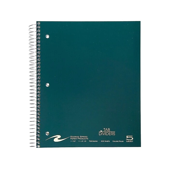 Organize your thoughts and ideas in this five-subject notebook. Tabbed dividers keep the five sections separate and provide space for labeling, making it easy to assign a single subject or category to each section. College-rule pages keep handwriting neatly aligned, and the spiral binding lets you quickly flip through pages. This Roaring Springs tabbed notebook features perforated pages for clean, tear-free removal.