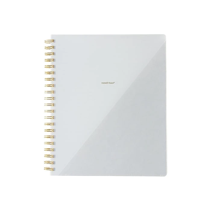 Understated sophistication with the Russell+Hazel signature spiral notebook. Features frosted front and back covers, gold-tone spiral binding, 196 ruled pages, and a bound pocket to keep any loose notes tidy. Pages include perforated edges for easy removal as well as space to note the date.