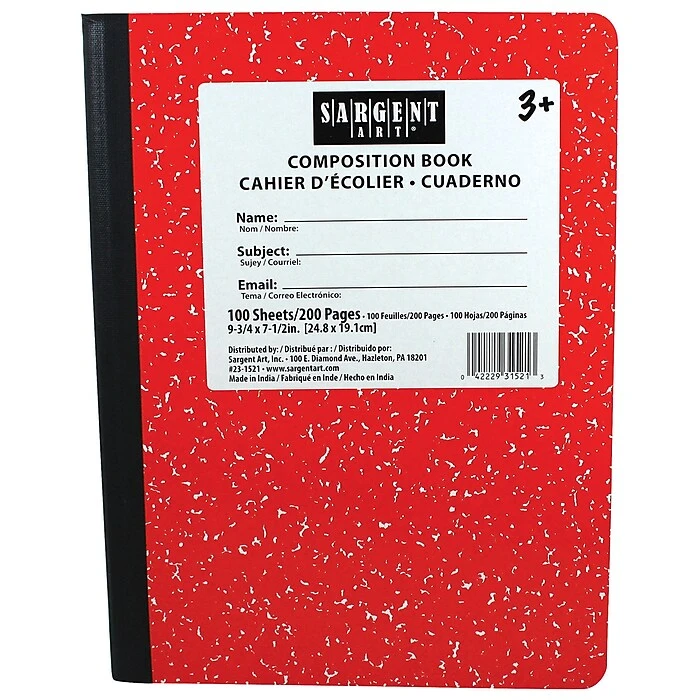 Composition Book features superb quality paper to suit and fit all your composition needs. Book measures 7.5″ x 9.75″ and is acid-free. Each hardcover book includes 100 wide ruled sheets. Composition book features a red marble cover. Sold as a pack of 12 books.