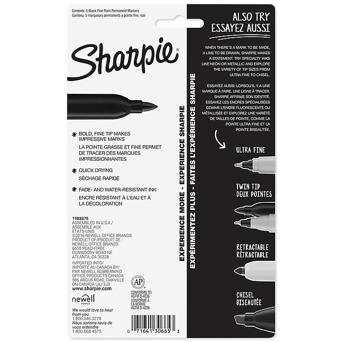 Create permanent lines with these black Sharpie fine-point permanent markers. The durable fine-point tip lets you make sharp, legible lines on most hard-to-mark surfaces, while the unique safety seal valve helps prevent dry-out. The quick-drying ink is waterproof, fade-resistant and reduces smearing. These black Sharpie fine-point permanent markers come in a pack of five, so keeping your home or office stocked is easy.
