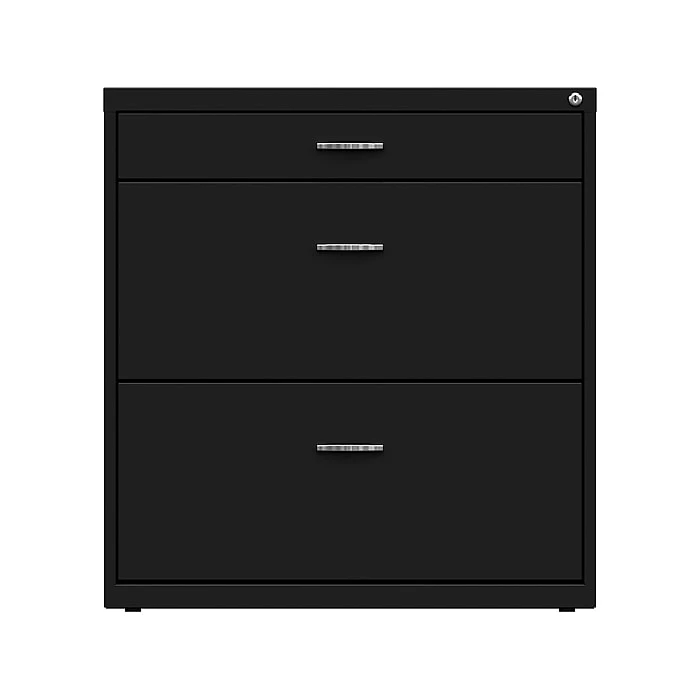 - Three-drawer lateral file cabinet designed for small office or home office use