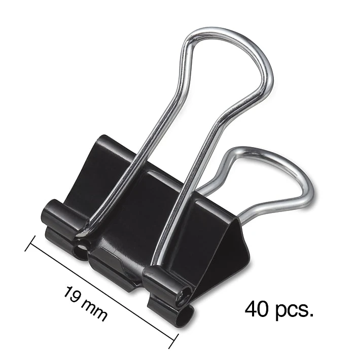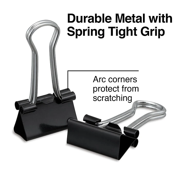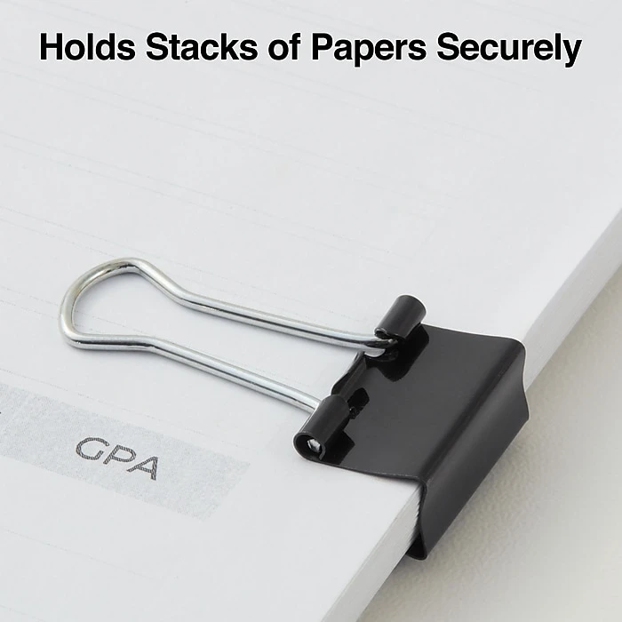 Prevent loose pages from falling out of the stack with these Staples metal small black binder clips. Each clip is black for a simple but professional appearance and has a 0.38-inch capacity for holding thick documents. These Staples metal small black binder clips come in a sturdy plastic tub that can also be used as a storage bin, saving space in desk drawers.