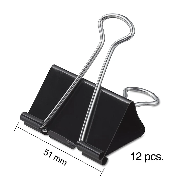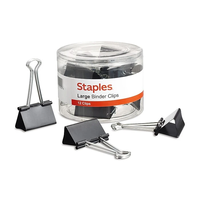 Sort paperwork and keep pages in order with these Staples large metal binder clips. Durable springs keep each clip in place, and the nickel-plated handles let you easily remove the clip from the papers. Packaged 12 per reusable plastic container, these Staples metal binder clips fit neatly in a desk drawer for convenient organization and easy access.