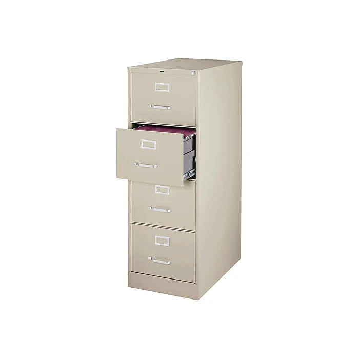 Make file management easy and keep your office organized with this four-drawer vertical file cabinet. Featuring four deep drawers, this cabinet accommodates large numbers of legal-sized folders and makes it easy to keep stored documents organized with built-in adjustable wire followers. The precision ball-bearing glides ensure the drawers open and close smoothly, while the galvanized structures offer impressive durability and let the drawers withstand heavy use. This four-drawer vertical file cabinet boasts a small footprint and fits easily in most workspaces.
