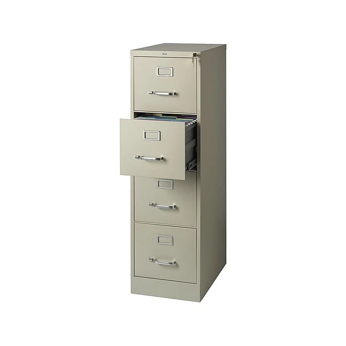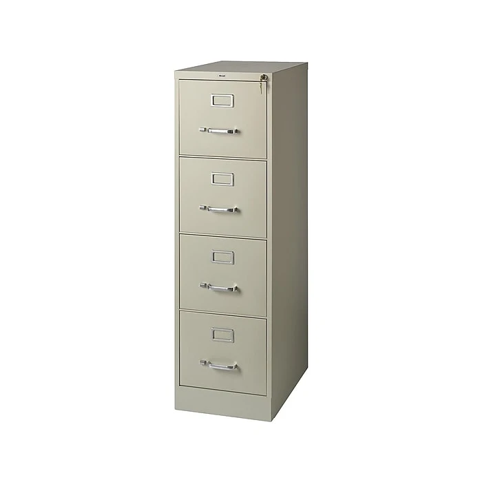Categorize and file paperwork with this four-drawer file cabinet. The vertical layout takes up little space, making it ideal for use in smaller offices or file rooms. Each drawer boasts precision ball-bearing glides to help them open smoothly and aluminum frames for easy labeling. A core removable lock system lets you control access to the contents stored inside, so you can file sensitive information with added confidence. Featuring adjustable wire followers, this vertical file cabinet accepts letter-size hanging folders for versatile document storage.