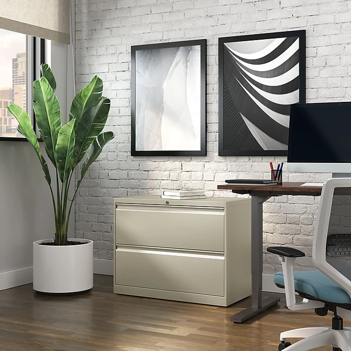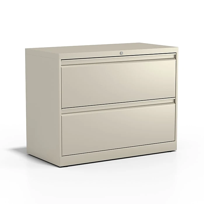 - Two-drawer lateral filing cabinet holds letter or legal size documents
