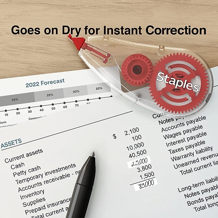 Replenish your supply of office desk essentials with these topwinder correction tapes. The fast-dry formulation lets you undo mistakes quickly and protects against smudges. Featuring an ergonomic contoured design, the dispenser fits snugly in hand and helps you revise copies effortlessly. The white tape rolls out and applies smoothly, giving you shadow-free pristine-looking documents. With 10 units in a pack, these Staples topwinder correction tapes provides ample, lasting supply.