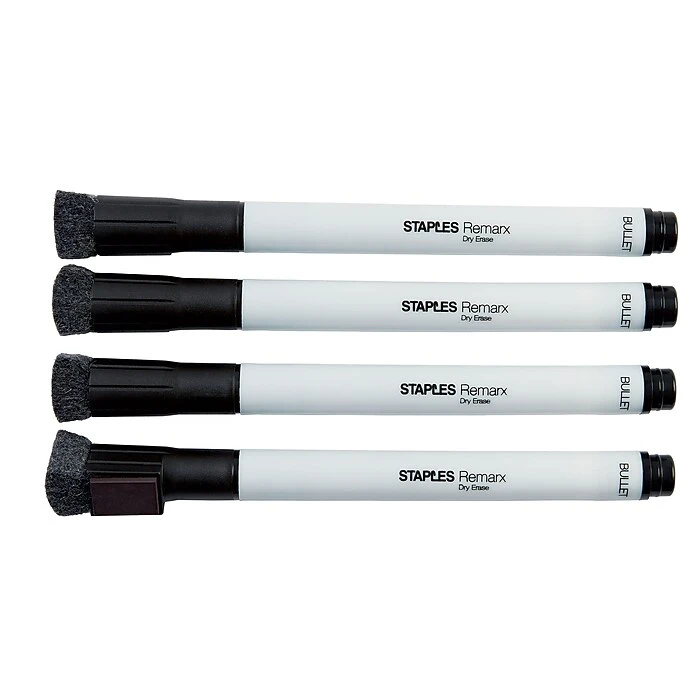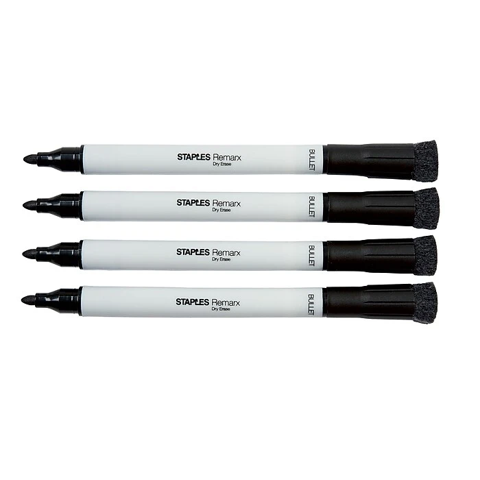 Write on the whiteboard and wipe it clean with these Staples Remarx black magnetic dry-erase markers. They have a bullet tip that lets you create thin or thick marks proportional to the amount of pressure applied. These Staples Remarx black dry-erase markers each have a magnet attached to the back, ensuring the handy pens stay where you leave them.