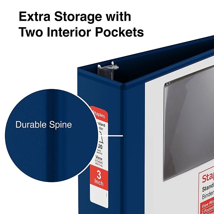Organize forms, schedules, data sheets, or manuals with this Staples standard view binder. The blue color and clear overlay make it easy to color-code and label your most important paperwork, while back-mounted D-rings keep pages flat for easy reading. This Staples standard view binder comes with two interior pockets, providing space for pens, pencils, calculators, and notes.