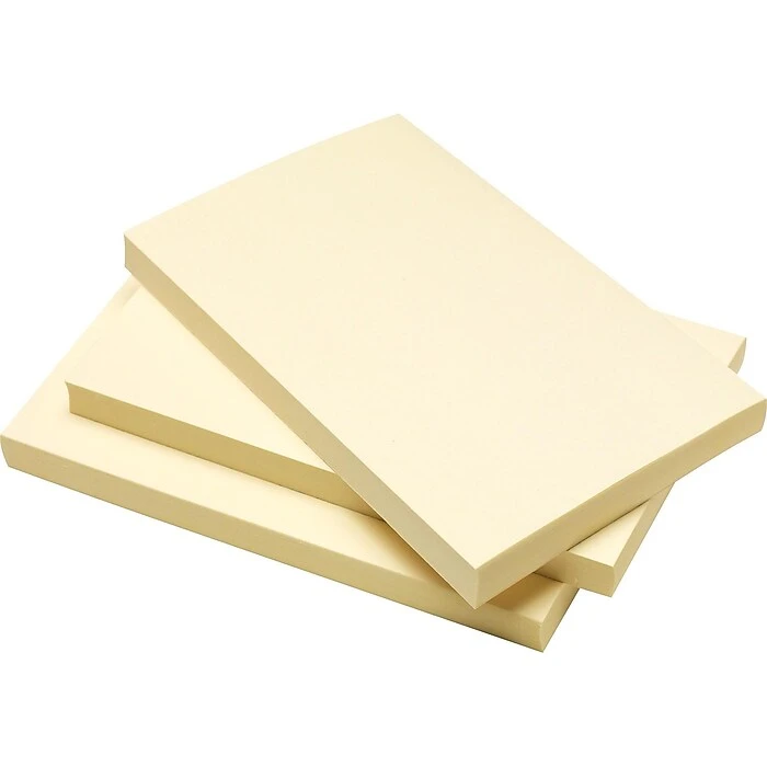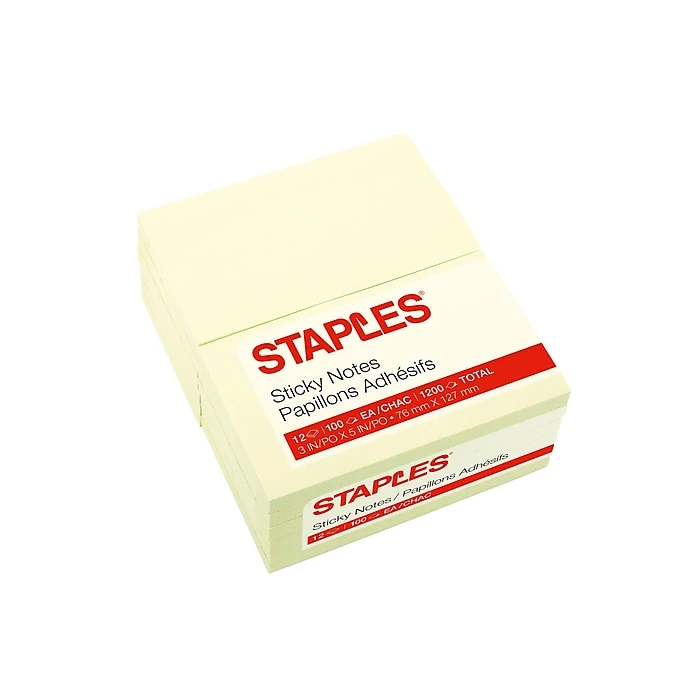 Jot down notes and reminders with convenience on these Staples Stickies yellow recycled notes. The generously sized notes feature a unique adhesive specially designed for use with paper and also stick and restick to just about any hard surface. These Staples Stickies recycled notes are made from 30 percent post-consumer content, making them an eco-friendly choice.