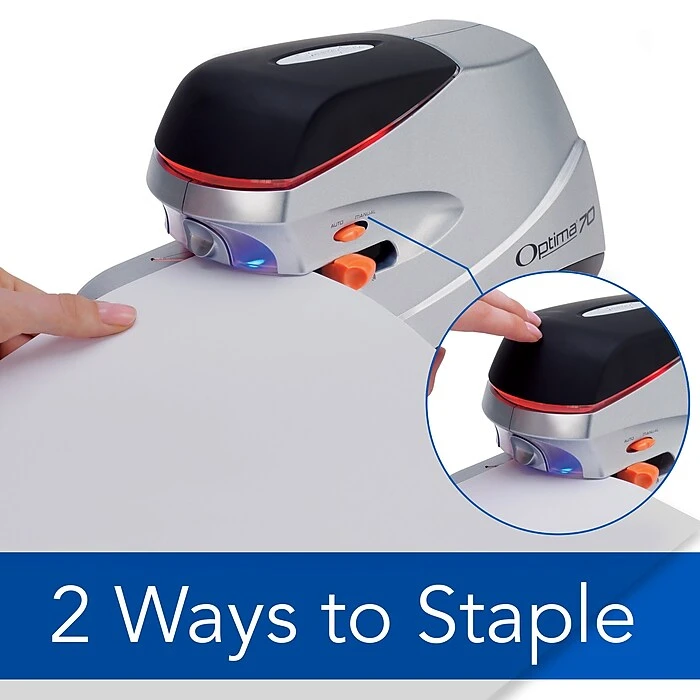 Quiet yet powerful, the heavy duty Optima® 70 can staple as few as 2 sheets or as many as 70 sheets with the same type of staple. This electric model with both automatic and manual operation always delivers Jam Free stapling.