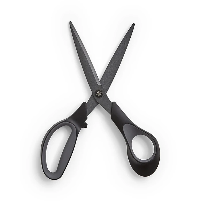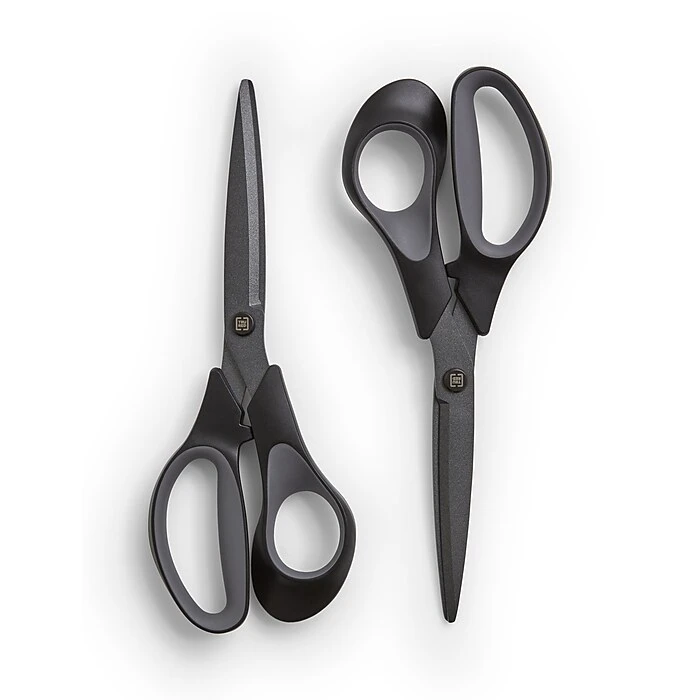 Cut through paper and cardboard with these 8-inch scissors. Nonstick titanium coating on the blades helps enhance strength and durability, while ergonomic handles boost comfort for long work sessions. These TRU RED™ 8-inch straight-handle scissors feature 3-D curved blades for precision cutting.