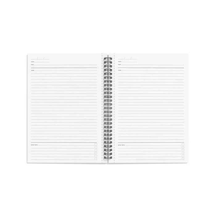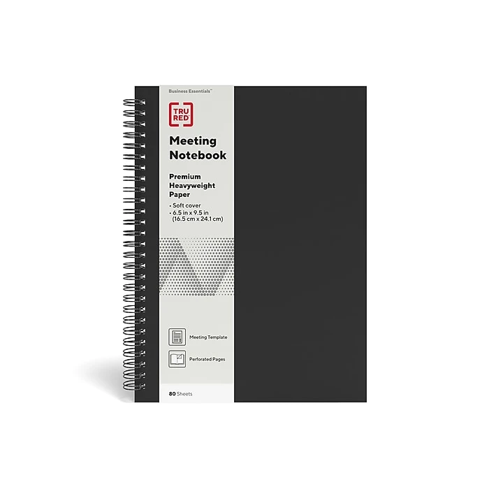 A meeting agenda template printed on each inner page provides proper space and guidance for detailed planning. This TRU RED™ medium black meeting notebook is bound with a durable double coil to stand up to the rigors of daily use.