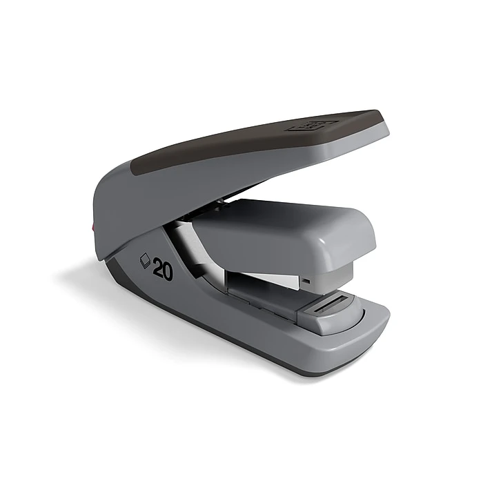Keep multipage reports securely fastened with this 20-sheet capacity half-strip desktop stapler. The front-loading staple tray is easy to refill to maintain productivity levels, while the reduced-effort design offers easy operation. This TRU RED One-Touch CX4 black/gray half-strip desktop stapler clinches flat so documents can be neatly stacked, while the rubber finish provides a comfortable grip and keeps the stapler securely in place during use.