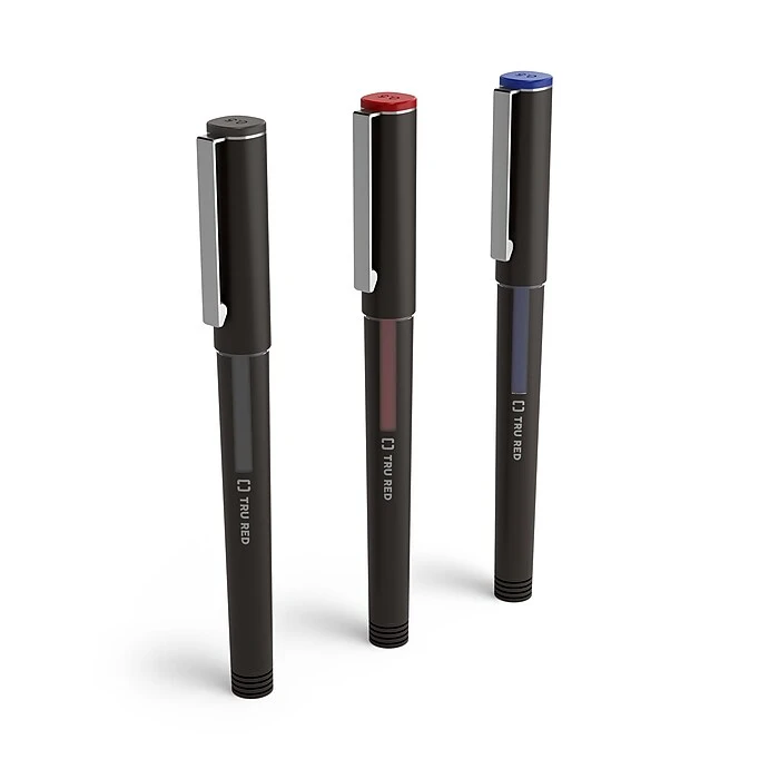 Fill up your pen cup with these assorted-color rollerball pens. The airplane-safe design ensures a leak-free travel experience, while the convenient ink level indicator lets you know when it’s time for a replacement. Get a professional upscale look from the matte finish and carbon steel clip. These TRU RED rollerball pens have a 0.5mm conical tip for clean, crisp lines and helpful color indicators for easy identification.