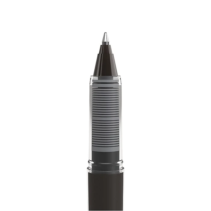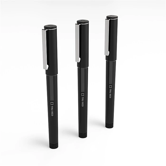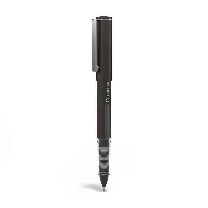 Sign documents and take detailed notes with this conical tip pen. An integrated ink level indicator supports effective pen use, while the free-flow ink system is airplane safe and keeps ink securely contained during cabin pressure changes. End-cap color and size indicators let you quickly identify this TRU RED 0.5mm black rollerball pen among your collection of writing tools.
