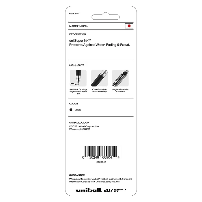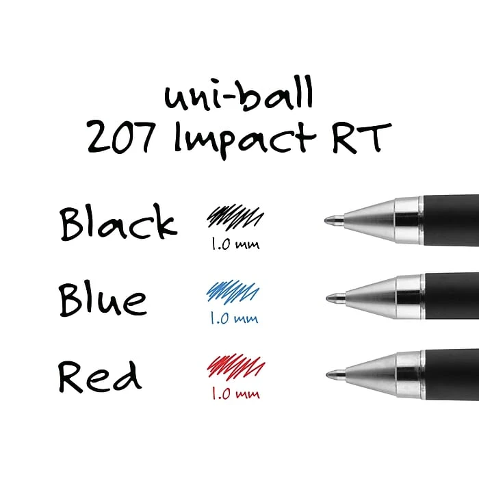 Experience smooth, consistent ink flow with this black-ink pen. The bold point allows for thick, noticeable writing, while the convenient retractable design keeps the tip tucked away, protecting papers from unintentional marks. This uni-ball Signo 207 Impact RT bold-point retractable black-ink pen comes in a pack of three, making it simple to keep one on hand at work, at home, and on the go.