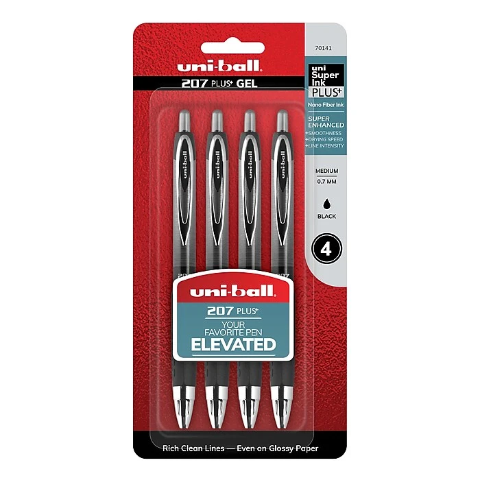 Take your writing to new heights with 207 Plus+ Retractable Gel Pens from uniball featuring a 0.7mm medium point with a stainless steel tip that resists bending and breaking. Advanced nano fiber gel ink produces an enhanced writing experience with exceptional smoothness, drying speed and line intensity, ensuring that every word is brilliantly communicated. Superior gel ink resists smudging and smearing, making these retractable gel pens ideal for everyday writing tasks, jotting down notes and signing all of your important documents. Medium point pens feature uni Super Ink PLUS+, entrapping the gel ink into the paper, producing fraud, fade and water-resistant documents that resist check washing or bleaching. The 0.7mm medium point produces rich, clean lines – even on glossy paper. Rubber grip gel pens provide an ergonomic hold that helps you complete long writing projects with greater comfort and precise control, while a translucent ink window indicates the level of gel ink remaining, so you don’t run out unexpectedly. Elevate your style with the sleek profile of the 207 Plus+ with modern metal accents and a designer metallic barrel.
