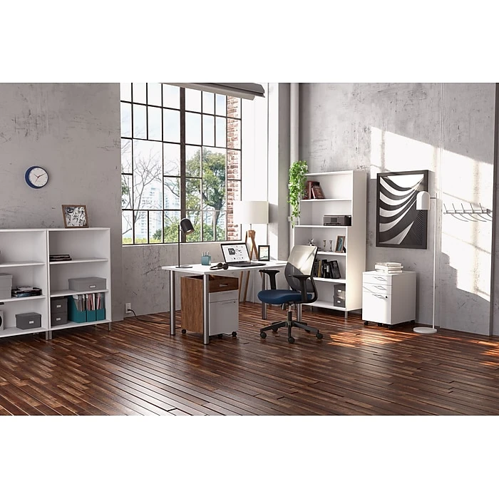 Sort paperwork, organize supplies and streamline your desk setup with this mobile pedestal file cabinet. The spacious file drawer accepts letter and legal document sizes for added versatility, and the box drawer keeps notepads, pens and other items close at hand. An open tray-style top shelf provides additional storage for frequently used work materials. This cabinet comes equipped with an integrated lock to protect sensitive company information. Featuring five rolling casters, this Union & Scale™ Essentials espresso and white file cabinet glides smoothly across your office floors.