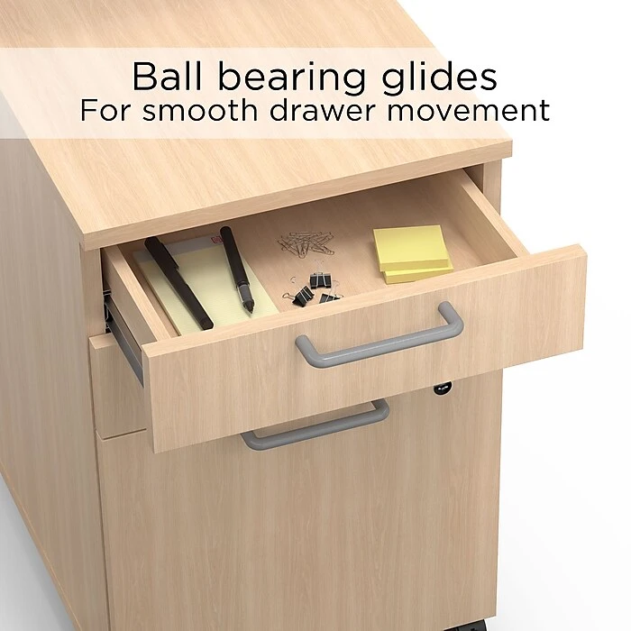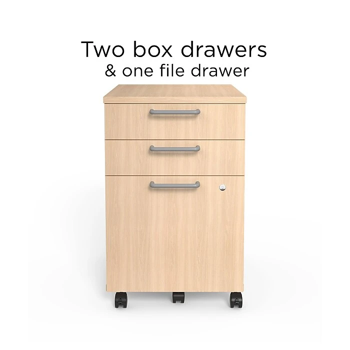 Put paperwork and supplies within reach when you use this mobile pedestal file cabinet. Two box drawers let you organize pens, staples and other office supplies, while the file drawer accepts letter and legal folder sizes for flexible sorting options. This cabinet boasts five rolling casters for effortless mobility. An integrated lock and included key secure confidential paperwork inside for an added layer of security. With a rich finish and sleek profile, this Union & Scale™ Essentials natural mobile pedestal file cabinet complements a range of contemporary office design themes.