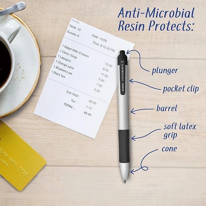 The same Sarasa Dry X20+ you’ve come to love, now with special built-in protection to help suppress the growth of bacteria. This pen uses a special resin incorporated into the plastic that makes it difficult for germs, bacteria, and viruses to grow. Take notes with sharp confidence and this Zebra black retractable gel pen. The thick barrel with a contoured rubber grip provides enhanced control and comfort. The pen glides across the pages without smearing or smudging due to its rapid-dry ink. The Sarasa Dry X20+ comes in a pack of 12, making it easy to keep your home or office stocked.