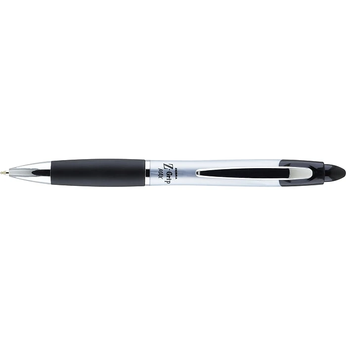 Get a high-performance writing experience with these 1.0mm medium-point retractable ballpoint pens. The silver and black colors give these pens a sleek, professional look, while the retractable design prevents unwanted marks when not in use. These Zebra Pen Z-Grip Max black ballpoint pens have textured rubber grips to prevent the pen from slipping, giving you solid control of your writing.